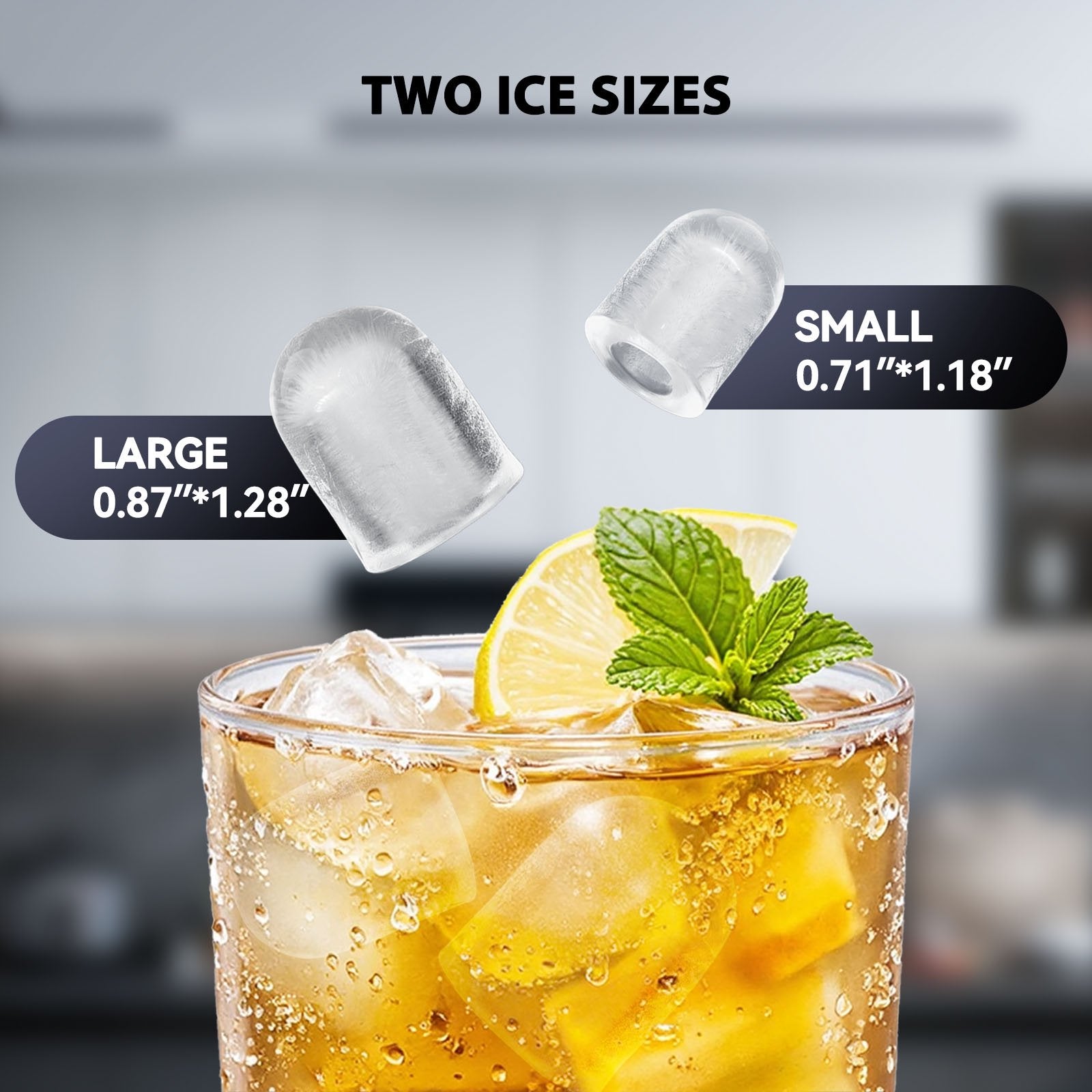 2-Size Ice Available: You can make two different sizes of ice cubes with this ice machine maker. Small ice cubes are great for keeping seafood or beer fresh and cool for a long time. Large cubes are better for making iced coffee or cold drinks for a quick cooling effect. Smooth bullet ice that won't hurt your hands or mouth during use.