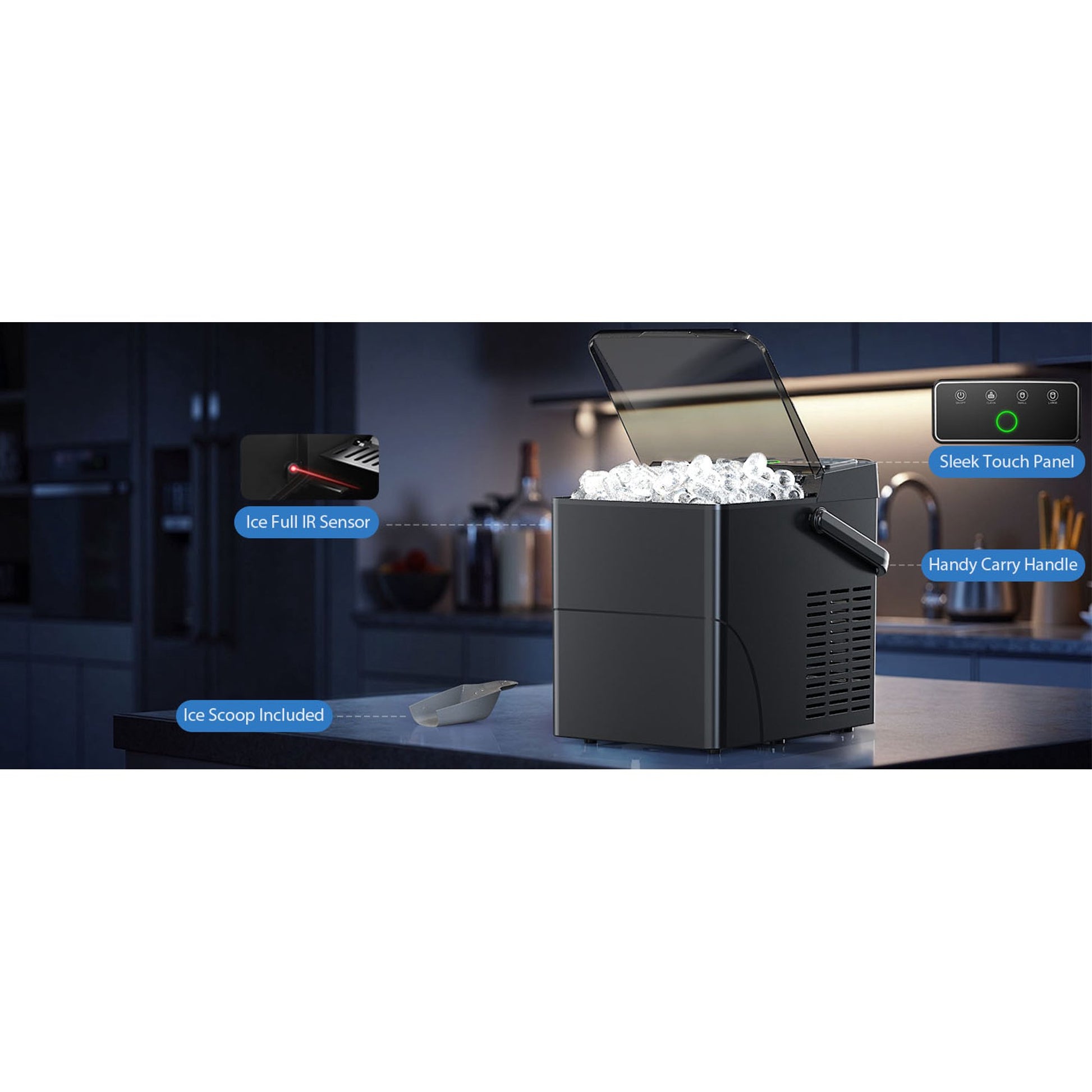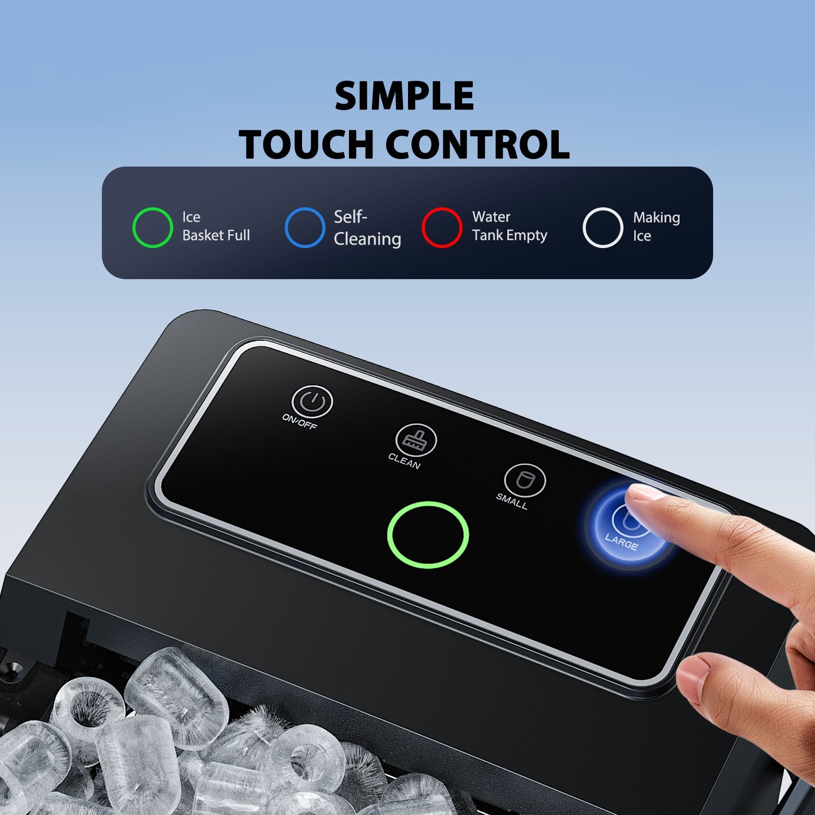Simple Touch Control: Upgrade your ice-making experience with a modern, easy-to-use touch control panel. It’s a step above traditional button-operated ice makers. A color LED light ring clearly shows ice maker status.