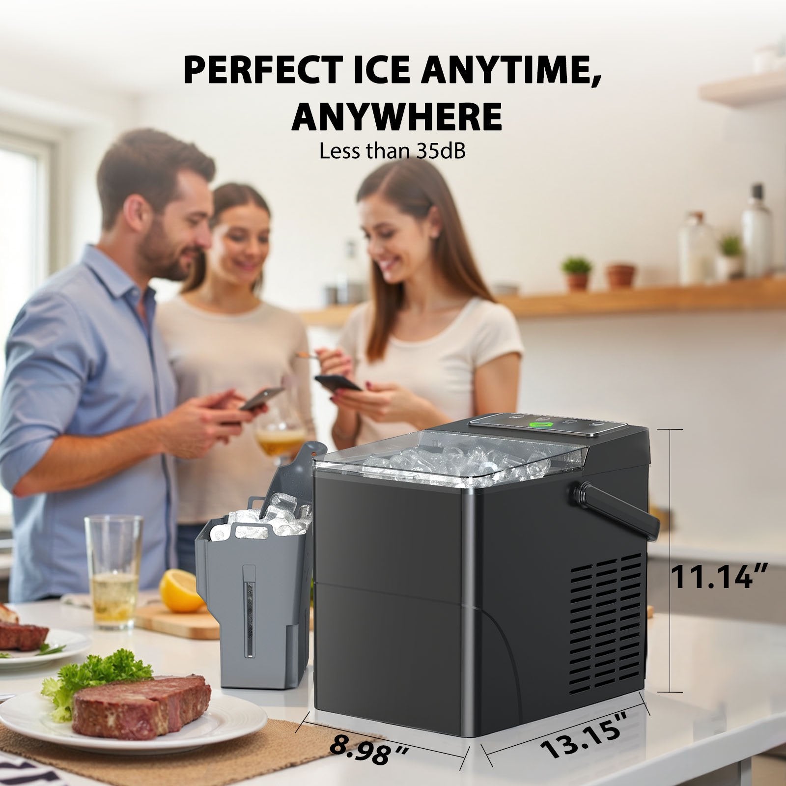 - Portable Design & Perfect Bullet Ice: Our ice maker comes with a sturdy handle, weighs only 14.55lbs and with compact size 11.29x 8.66x 12.67in. Those features make ice maker easy to carry and perform well on any occasions like Kitchen, Camping, RV, Party.