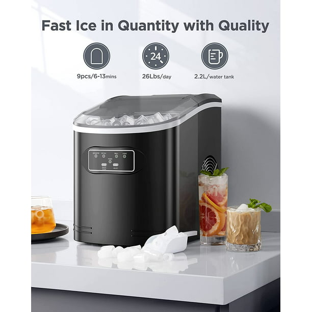 - FAST ICE MAKER: The ice maker only takes 6 minutes to make 9 bullet-shaped ice cubes. Fill 2.2L of water into the water tank, maximum ice capacity can reach 26 pounds in 24 hours