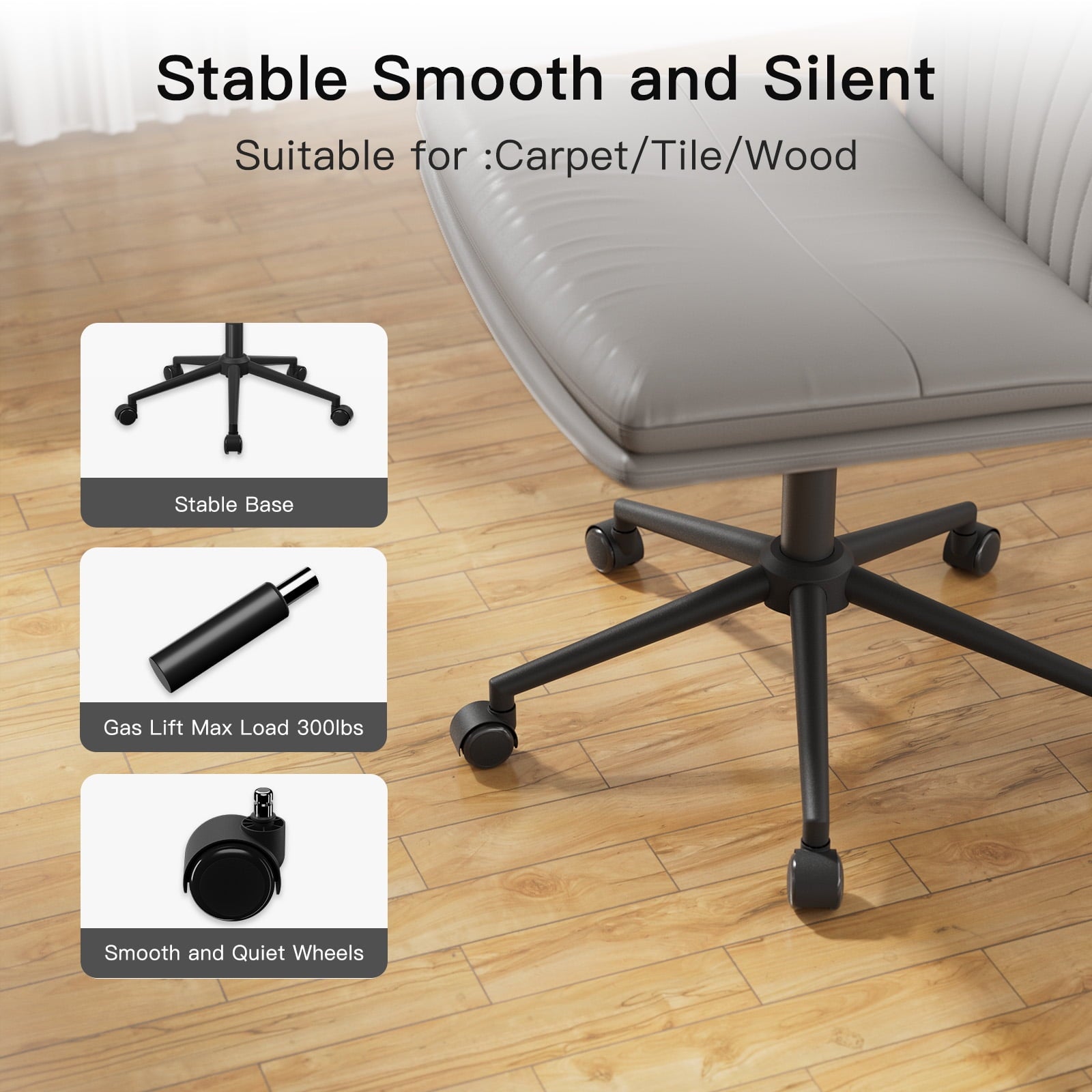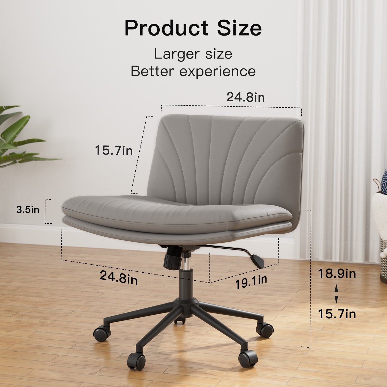 Armless Office Desk Chair with Wheels,PU Leather Cross Legged Wide Chair,Mid Back Adjustable Swivel Computer Task Chairs Vanity Chair for Home,Office(Gray)