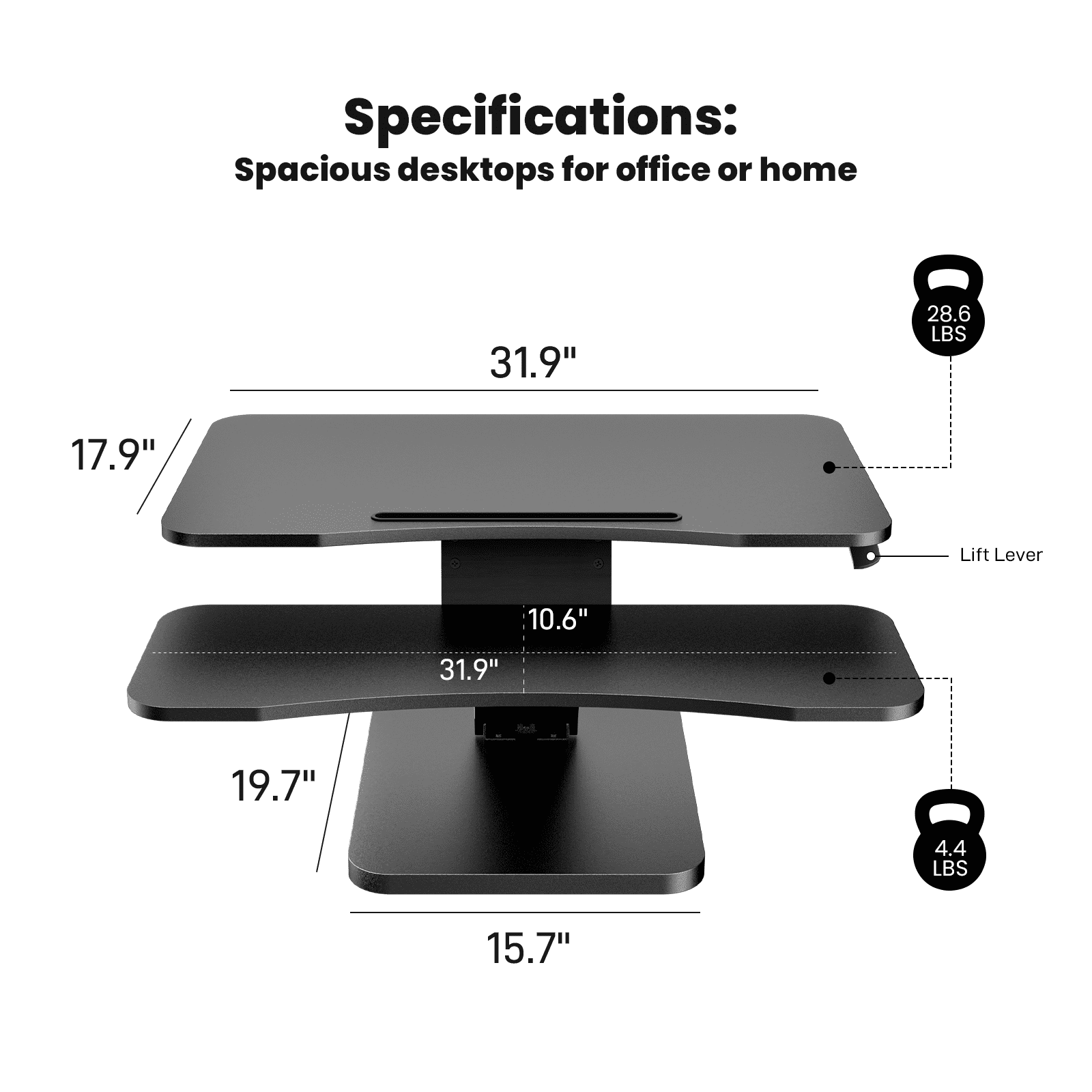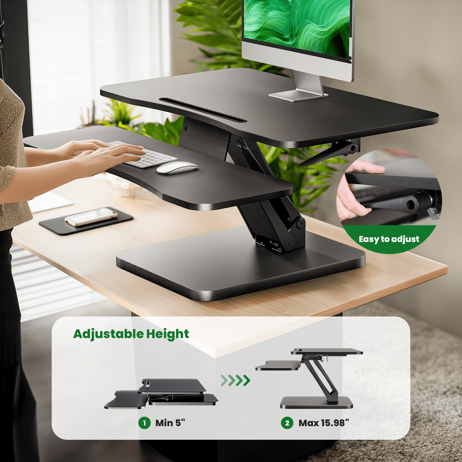 - SIT TO STAND UP: Standing desk converter can improve health. With a gas spring, you can adjust your desk riser from 5" to 15.98" in one smooth motion via pressure handle
