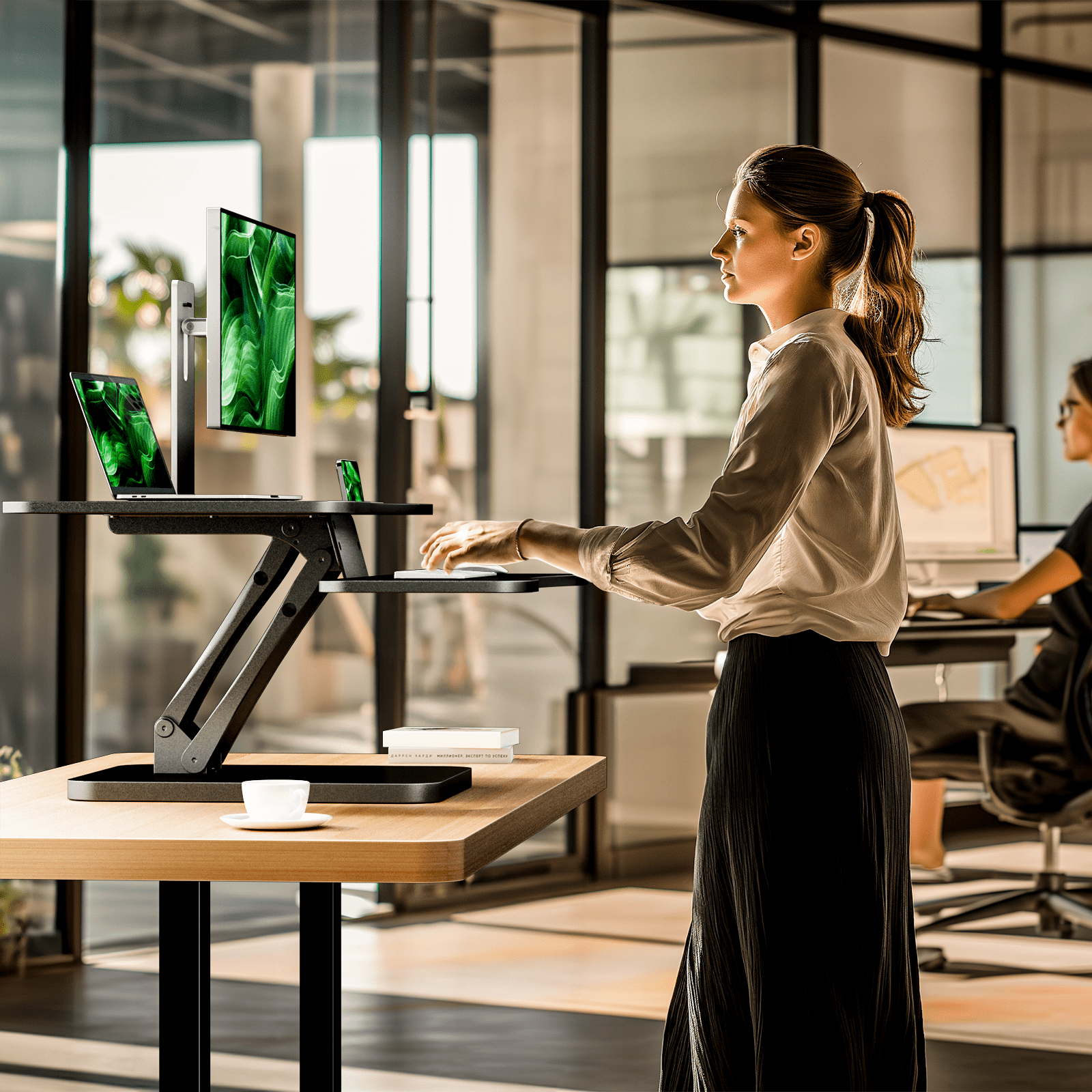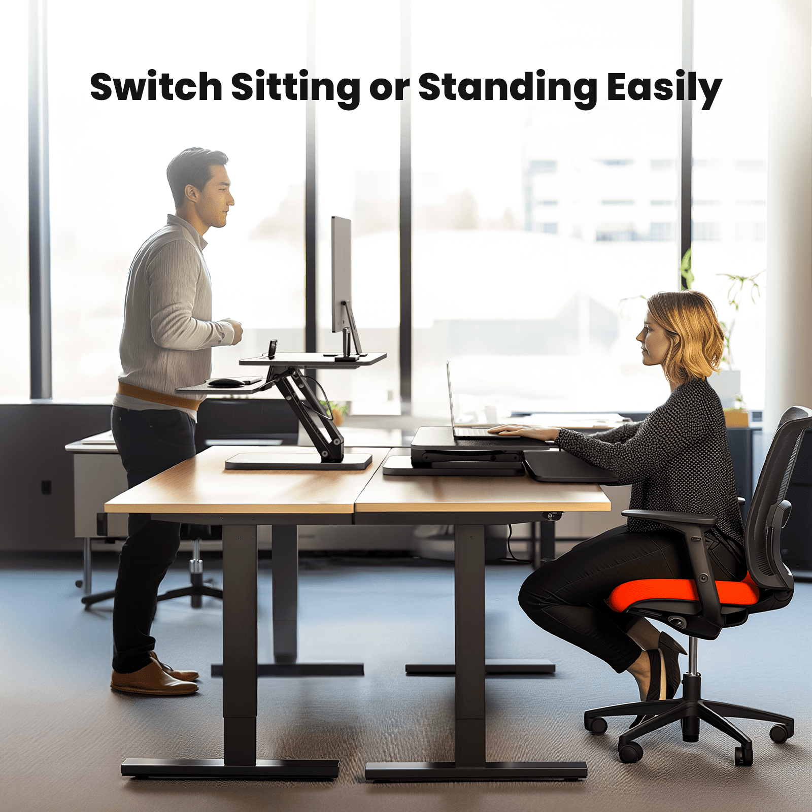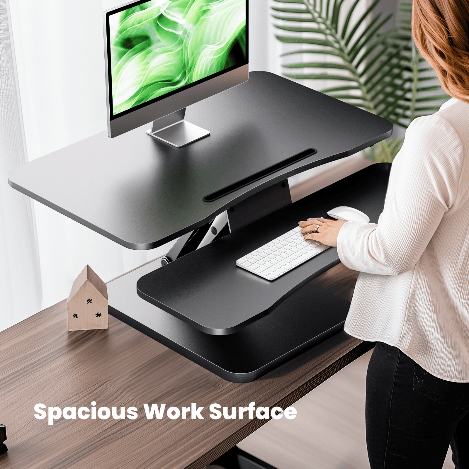 Height adjustable tabletop desk. This dual-tiered platform sits on top of your current desk and gives you the benefit of standing or sitting on demand. The keyboard tray is removable for user preference. Transitioning between sitting and standing throughout the long workday provides numerous health benefits for the body . Standing throughout the day also helps the mind stay alert and productive. Designed for ergonomic comfort Flat surface standing desk perfectly accommodated your laptop, monitor, keyboard, mouse, and more!