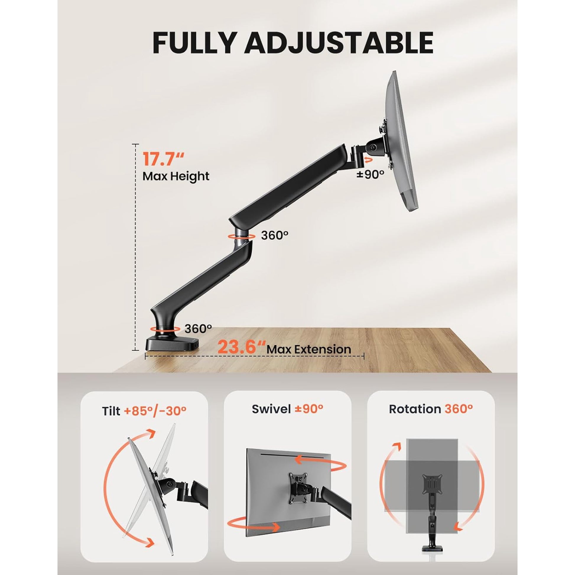 - Flexible Adjustment: Experience true ergonomic comfort thanks to full motion flexibility. The monitor arm features +85°/-30° tilt, +/-90° swivel, 360° rotation, and a maximum height of 17.7 inches, allowing you to find the optimal viewing angle for your unique workspace.