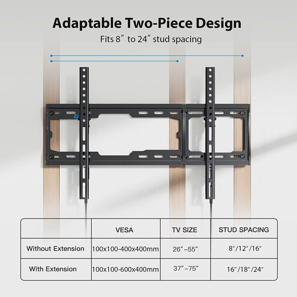 - More Versatility: The TV wall mount bracket is designed with a two-piece wall plate to provide extra flexibility when mounting. The main wall plate can accommodate most 26-55 TVs by itself, while combining both wall plates can securely hold most 37-75 TVs. The wall plate also has openings to accommodate an electrical outlet on the wall