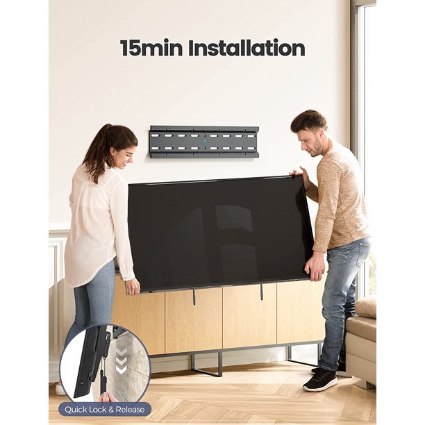 - SAFE AND STURDY: High quality steel construction ensures safety. This wall mount TV bracket features a locking mechanism with quick release to easily secure your TV to the mount. Pull down strap disengages the lock without the need for a tool