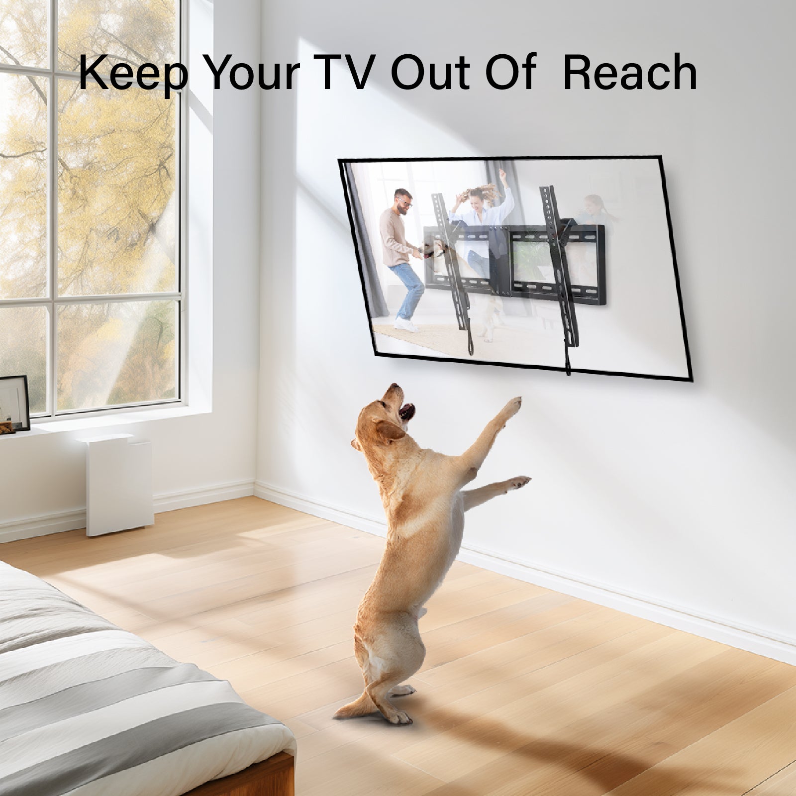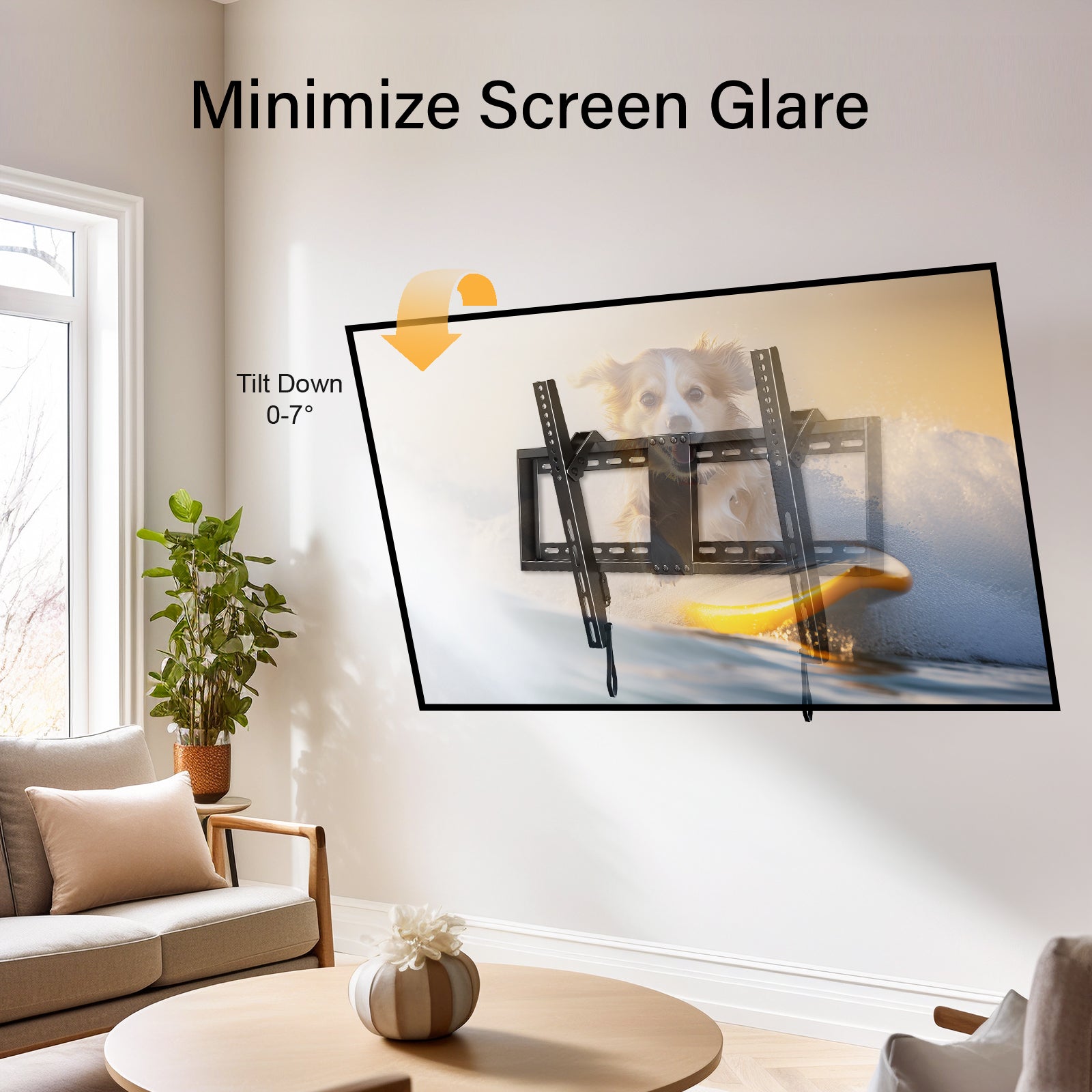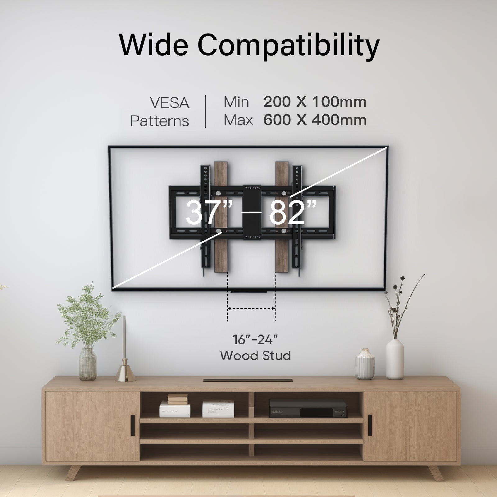 The tilting tv wall mount bracket is suitable for 32" - 82" flat-panel TVs, like 70 in TV mount. Its tilting system makes it easier to adjust the viewing angle. The design ensures TV mounting stability and security. Adjustable TV brackets offer lateral shift movement to allow perfect TV position, even with off-center wall wood studs. TV is positioned just 1.2" / 30.4 mm from the wall for a clean, low-profile appearance.