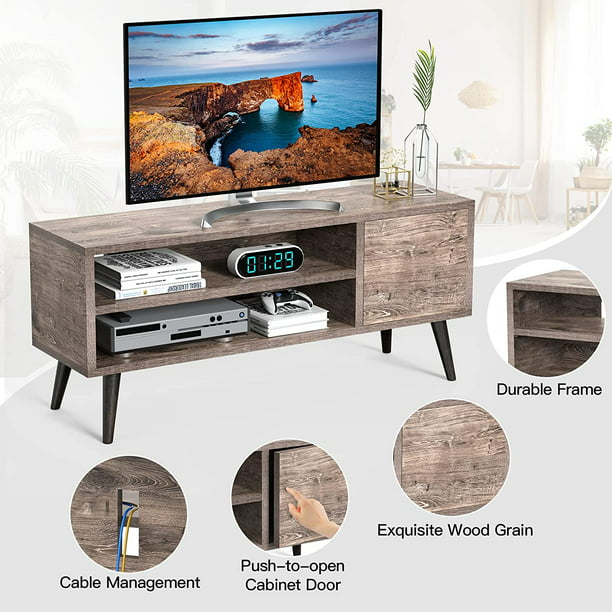 - Fine Details-This TV stand with an adjustable shelf comes with a hole at the back for easy cable management. The on-trend pop-out door is easy to open without creeking sounds. The TV console is 8.15in high off the ground which makes house cleaning a breeze