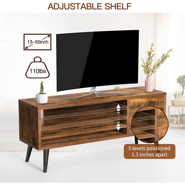 - Spacious Storage- The overall dimension of this retro TV console is 47.24 (L) x 23.85 (H) x 15.74 (W). The cabinet top surface has a loading capacity of up to 110lbs and is suitable for TVs up to 55inch. The cabinet offers spacious storage space for audio-visual equipment, PlayStation, Xbox, soundbar, Blu-ray player holding up to 25lbs of weight