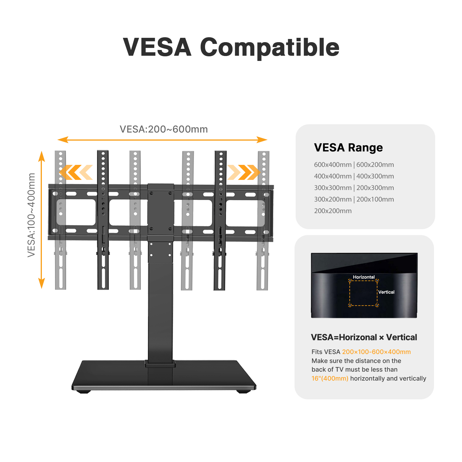 Easy to adjust the height of TV , it has 3 mounting height options so you can get the correct viewing height you are looking for; Heighten your plenty of space to place soundbar or place your TV at the lower level to keep it from tipping; Cable holders on the Back are a big bonus. Keep your cable and accessories organized and neat. Fits 100x100-600x400mm,make sure the distance on the back of TV must be less than 16''(400mm) horizontally and vertically.